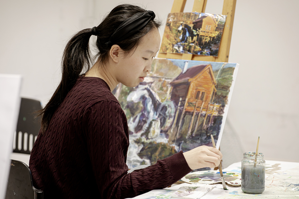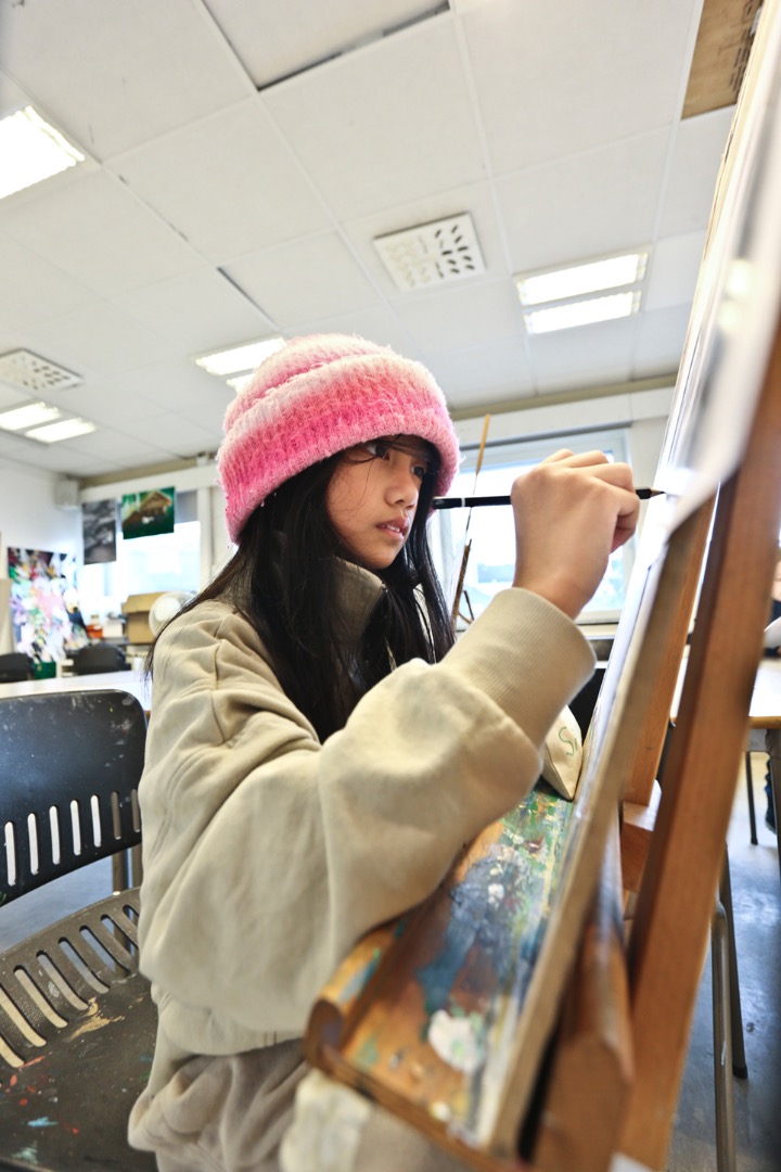 Innerst i hjørnet sitter Isabella (13) og maler et landskap med en elv og en gammel mølle. Hun har gått på kulturskolen siden hun gikk på SFO, og ser ut til å ha god kontroll både på motiv og farge. I tillegg til å være her hver mandag går hun også på billedkunst fordypning, som har 10 helgesamlinger i løpet av året.