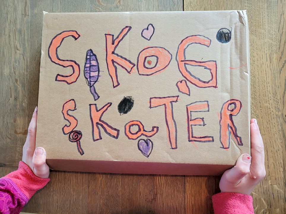 Ei pappøskje blir ei fin skogskattekiste. Vi pyntar øskja utanpå, og lagar fine små rom inni av pappbitar og teip. På neste skogsundag finn me sikkert noko anna som me vil putte i skattekista.